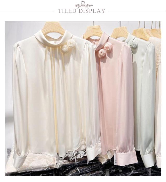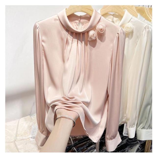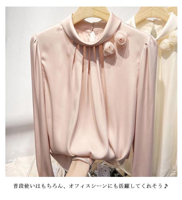 送料無料 サテン調 シャツブラウス レディース 立体フラワー 長袖シャツ ブラウス トップス ゆったり 大きいサイズ 無地 キレイめ 30代 40代 ママ