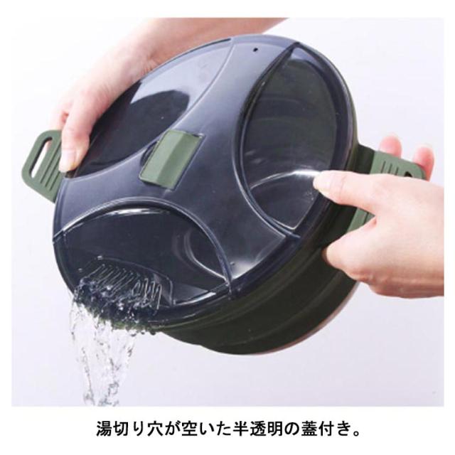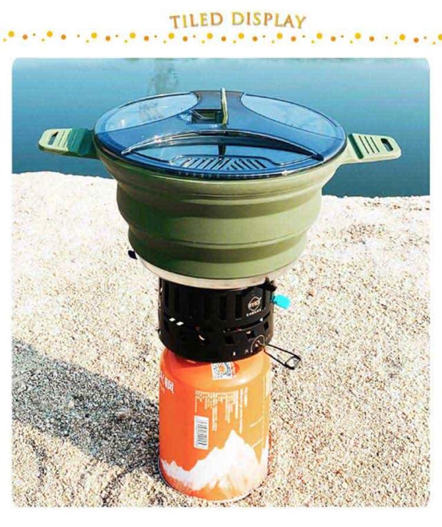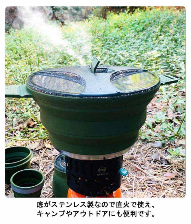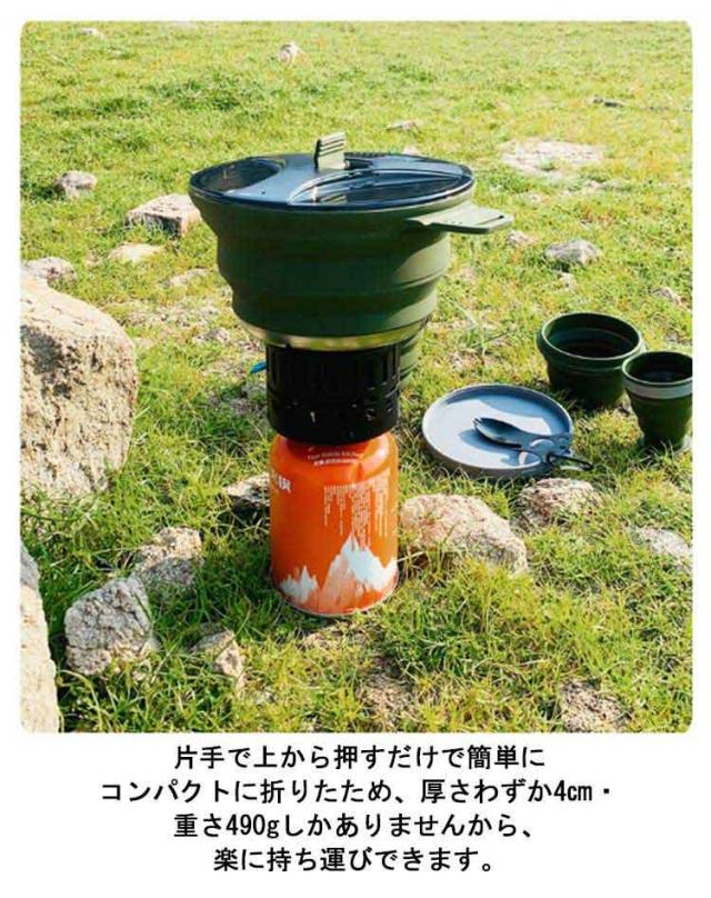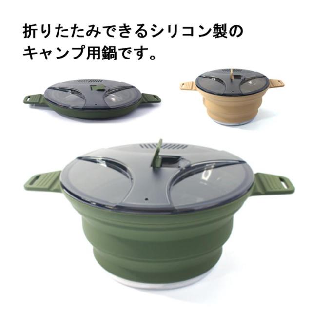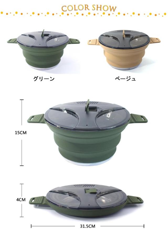 | 折りたたみできるシリコン製のキャンプ用鍋です。 片手で上から押すだけで簡単にコンパクトに折りたため、厚さわずかcm重さ490gしかありませんから、楽に持ち運びできます。 底がステンレス製なので直火で使え、キャンプやアウトドアにも便利です。 湯切り穴が空いた半透明の蓋付き。 | |