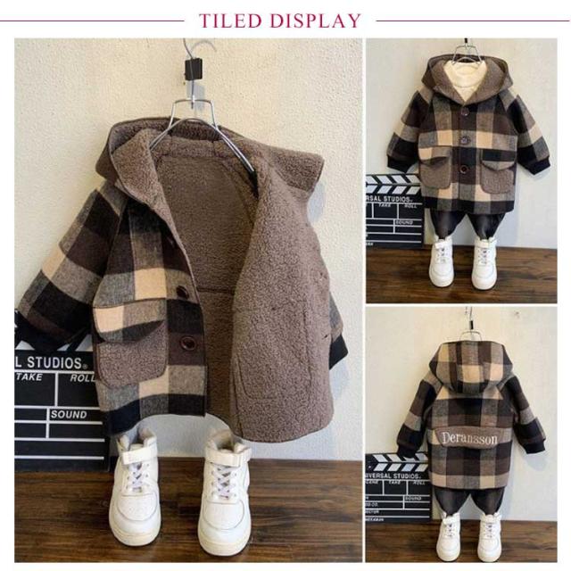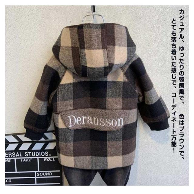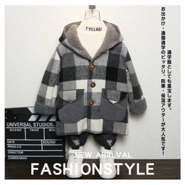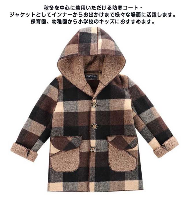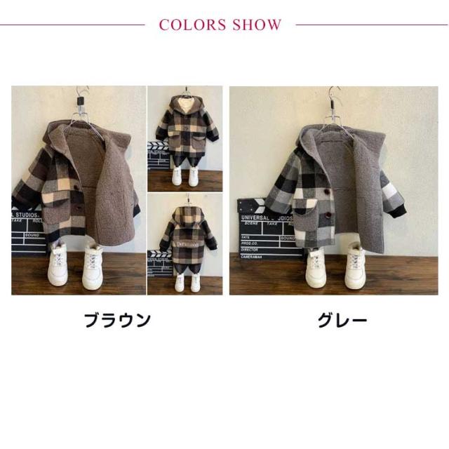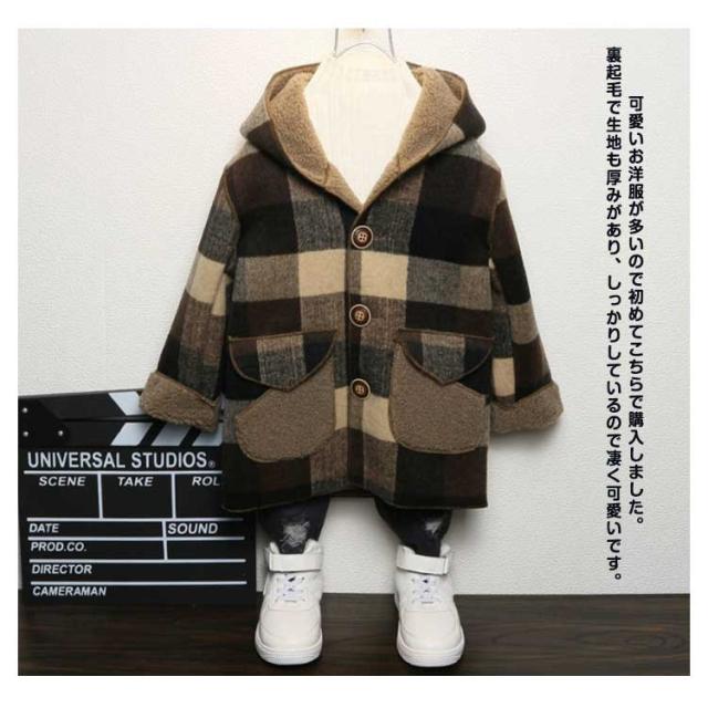 ボアコート ダッフルコート アウター キッズ フード付き ベビージャケット 子供服 可愛い 男女兼用 裏ボア 冬服 防寒 暖かい コート チェック柄 ミドル丈 ブラウン グレー 送料無料