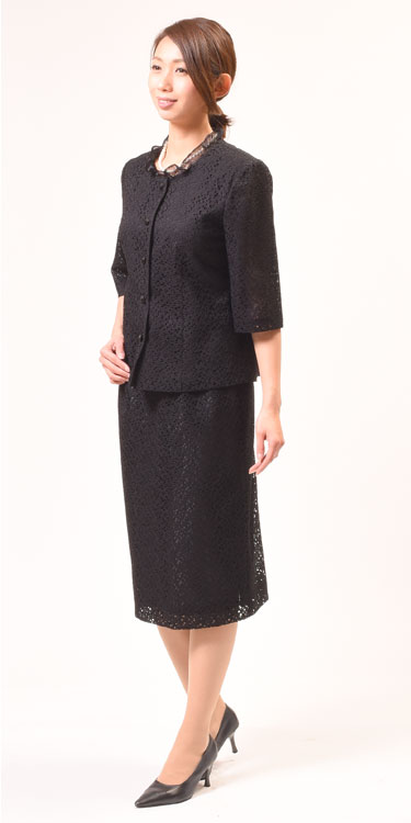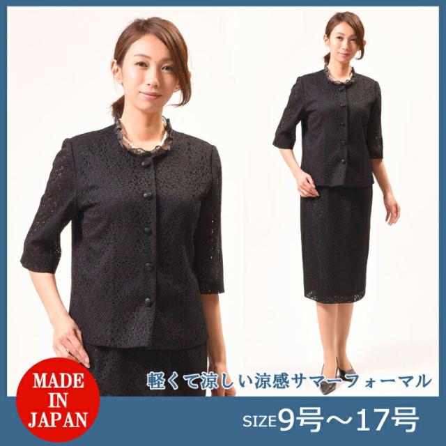 夏用 ブラックフォーマル スーツ ブラウス+スカート レディース 婦人 礼服 喪服 :RL2796 大きいサイズ 9号から17号 日本製 黒 レース生地 スカートスーツ 冠婚葬祭 葬儀 葬式 通夜 法事 法要 礼装 サマーフォーマル