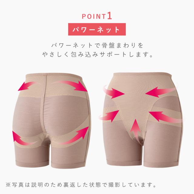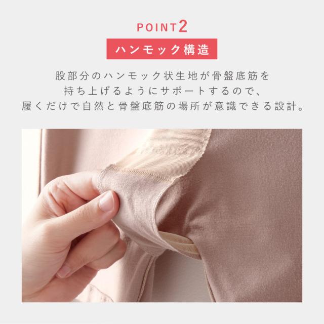 骨盤まわりをパワーネットでやさしく包み込み、緩んだ骨盤底筋をハンモック構造で下から持ち上げるようにサポート。股部分のハンモック状の生地が骨盤底筋を持ち上げるようにサポートするので、履くだけで自然と骨盤底筋の場所が意識できる設計です。
