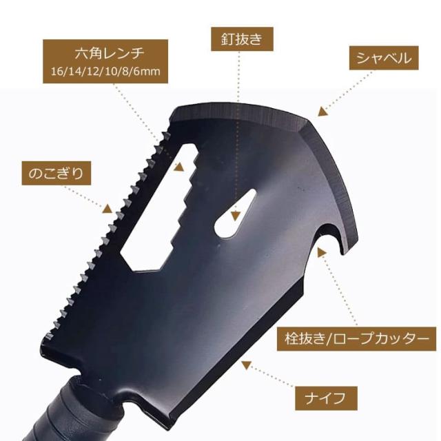 土堀り用シャベルとしてだけでなく、のこぎり・ナイフ・栓抜き・釘抜き・六角レンチとしても利用できます。