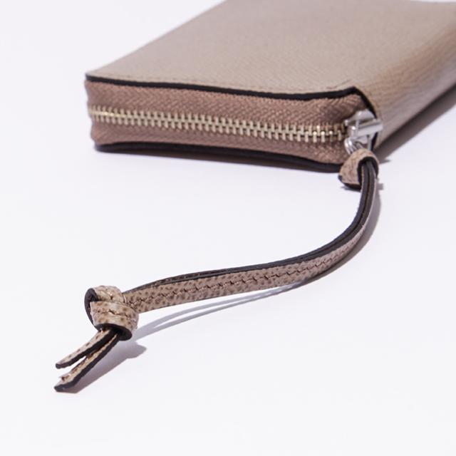 | 本体には、フランス最古のタンナー「DEGERMANN社」(現:HAAS社)の最高級カーフレザーを使用しています。 独自のレシピによる製法を守り続けながら、世界の名だたるメゾンに素材を提供し続けています。 少しコシのあるカーフレザーにエンボス加工を施し、二段染めによる風合いが、安価なレザーでは表現出来ない高級感が魅力です。 本来「ハンドバッグ」の様な、フォーマルなアイテムに用いられる素材ですが、相反するカジュアルなアイテムや小物に落とし込み、柔らかいフォルムでデザインしました。 イタリア「PRYM社」の小気味良いホックの質感もアクセントになっています。 |