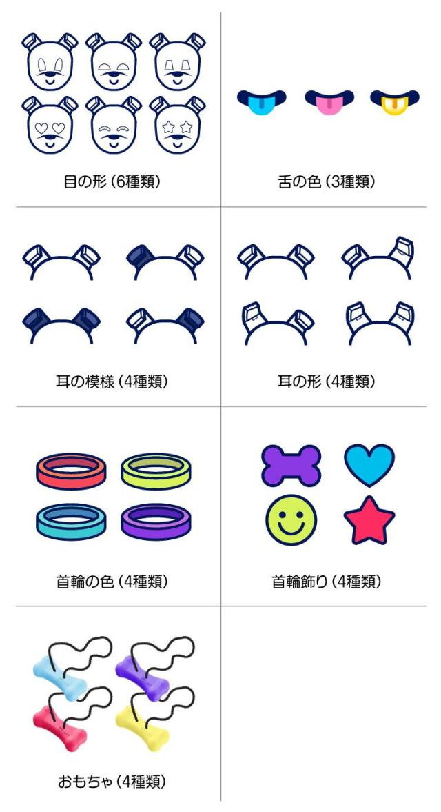 目の形や耳の色などの見た目はバリエーション豊富で、さらに初めて遊ぶときに「目」「足」「胸」の色が決まるので、外見の組み合わせは無限大!同じ見た目の子は他にはいない、あなただけのペットロボットです。