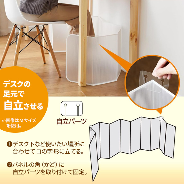 自立させて使う…使用場所で全体がコの字になるように立てて、付属の自立パーツを使って上部の2角を固定します。