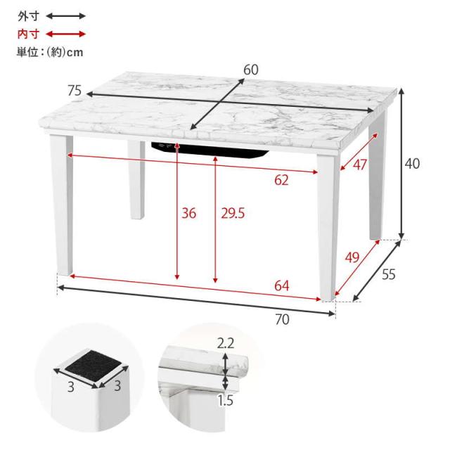 こたつセット こたつテーブル 掛け布団 長方形 75×60cm 一人用 おしゃれ 大理石調 コンパクト モノトーン 韓国風インテリア