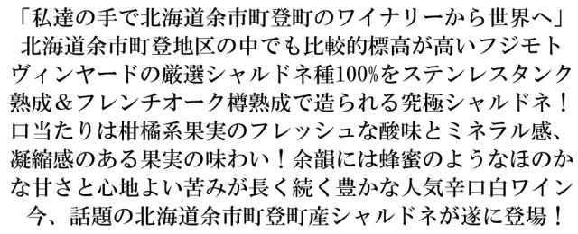 「私達の手で北海道余市町登町のワイナリーから世界へ」 北海道余市町登地区の中でも比較的標高が高いフジモト ヴィンヤードの厳選シャルドネ種100%をステンレスタンク 熟成&フレンチオーク樽熟成で造られる究極シャルドネ! 口当たりは柑橘系果実のフレッシュな酸味とミネラル感、 凝縮感のある果実の味わい!余韻には蜂蜜のようなほのか な甘さと心地よい苦みが長く続く豊かな人気辛口白ワイン 今、話題の北海道余市町登町産シャルドネが遂に登場! ■さまざまなギフトアイテムをご用意しております。お中元 ギフト 御中元 お盆 お礼 敬老の日 クリスマス 冬ギフト お歳暮 御歳暮 お年賀 御年賀 お正月 年末年始 ご挨拶 バレンタイン ホワイトデー お返し 父の日 母の日 ギフト 贈答品 お土産 手土産 御祝 御礼 内祝い 引き出物 お祝い 結婚祝い 結婚内祝い 出産祝い 出産内祝い 引き菓子 快気祝い 快気内祝い 進学祝い 誕生日祝い バースデーケーキ プレゼント Wedding ウェディング ホームパーティ お花見 パーティ 退職ギフト 退職 就任祝い