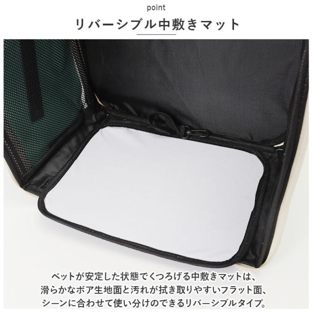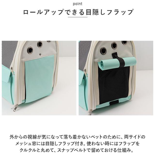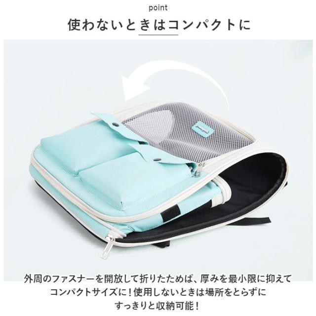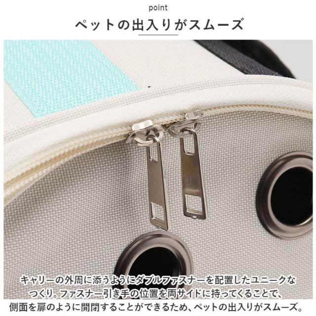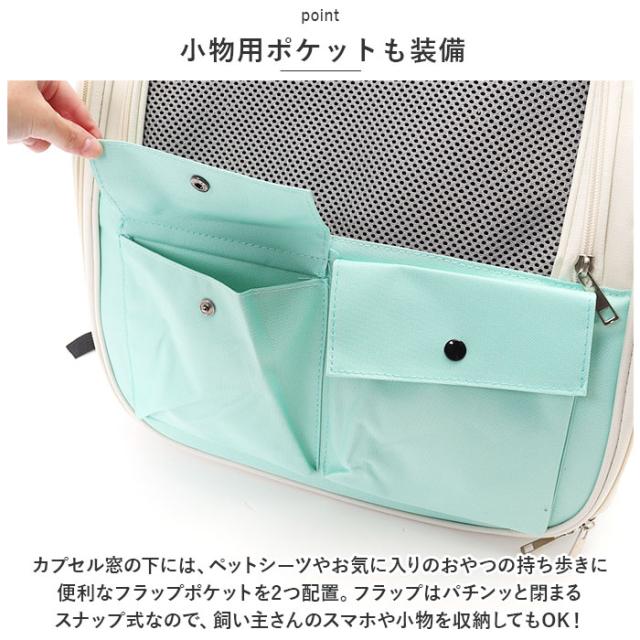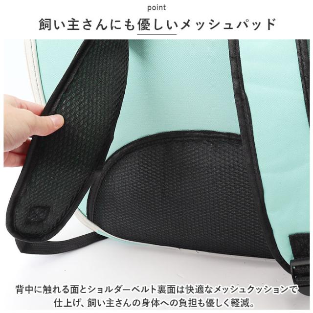 | 商品説明 | ・ペットとのお出掛けが楽ちんなリュックタイプ!折りたためる「2WAYペットキャリー」が新登場。 【通気性の高い安心構造】 ・キャリー前面と両サイドのメッシュ窓に加えて、6つの丸い通気孔を配置することで通気性をしっかりと確保。蒸し暑さの気になる季節も風がフワッと通って快適。 【ペットの出入りがスムーズ】 ・キャリーの外周に添うようにダブルファスナーを配置したユニークなつくり。ファスナー引き手の位置を両サイドに持ってくることで、側面を扉のように開閉することができるため、ペットの出入りがスムーズ。 【ペットが落ち着くファスナー窓】 ・前面のメッシュ窓はファスナーでコの字型に開閉可能。外出先でペットにおやつをあげたり、ネコちゃんの頭を撫でで安心させてあげたいときに便利。 【ロールアップできる目隠しフラップ】 ・外からの視線が気になって落ち着かないペットのために、両サイドのメッシュ窓には目隠しフラップ付き。使わない時にはフラップをクルクルと丸めて、スナップベルトで留めておける仕組み。 【リバーシブル中敷きマット】 ・ペットが安定した状態でくつろげる中敷きマットは、滑らかなボア生地面と汚れが拭き取りやすいフラット面、シーンに合わせて使い分けのできるリバーシブルタイプ。 【飛び出し防止ストラップ】 ・リュック内側には、リード金具と接続できるフック付きストラップを搭載し、ペットの急な飛び出しを防止! 【小物用ポケットも装備】 ・カプセル窓の下には、ペットシーツやお気に入りのおやつの持ち歩きに便利なフラップポケットを2つ配置。フラップはパチンッと閉まるスナップ式なので、飼い主さんのスマホや小物を収納してもOK! 【リュック&手持ちの2WAY仕様】 ・手提げスタイルはもちろん、リュックスタイルで背負えば、両手が空いて移動が楽ちんな2WAY仕様。 【飼い主さんにも優しいメッシュパッド】 ・背中に触れる面とショルダーベルト裏面は快適なメッシュクッションで仕上げ、飼い主さんの身体への負担も優しく軽減。 |