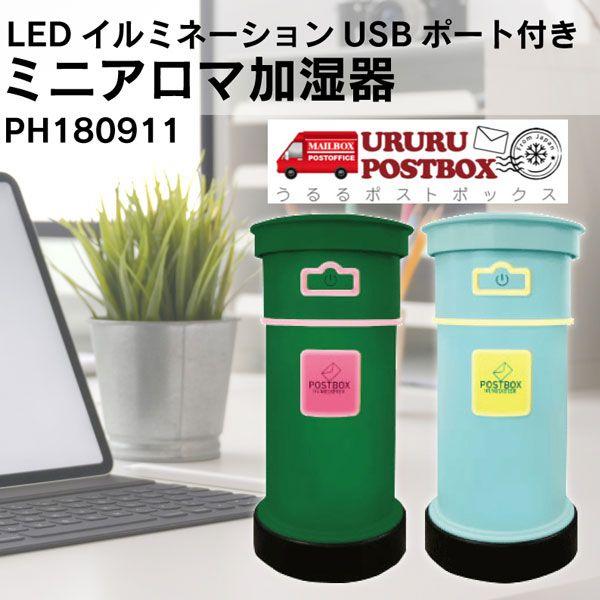 HIRO USBポート付き ミニアロマ加湿器 URURU POSTBOX うるるポストボックス ブルー LEDイルミネーション付き! PH180911(BL)