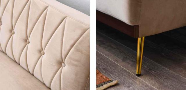 背もたれに施したダイヤ柄のステッチ、足元の無垢材、ゴールドカラーのスタイリッシュな脚の組み合わせは、上品で高級感溢れるデザインです。脚を取り外してもお使いいただけます。