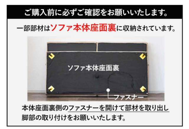 | 注意事項 | ※一部部材はソファ本体座面裏のファスナー内に収納されています ※脚を取り付けるだけの簡単組み立てです |