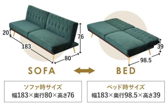 | サイズ | 約 幅183×奥行80×高さ76(cm) ベッド時:幅183×奥行98.5×高さ39(cm) |