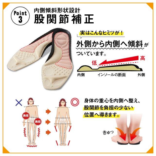■内側誘導形状 普段の靴に入れるだけ!身体の重心を内側へ整え、股関節を負担の少ない位置へと導きます。■クッション機能 3Dアーチ設計で足裏アーチを整え足のクッション機能をアシスト。歩行時の足の痛みや疲労を引き起こしにくくします。 ■母趾球加重 骨盤傾斜が起こると身体の重心バランスが崩れ腰が痛みやすくなるため母趾球重心に骨盤を立て正しい姿勢へと導きます。 ■腰に優しい インソールの裏側にはにはやわらかハニカムゲルや足運びを促進する高反発クッションを内臓。 ■プロの共同開発 腰痛に悩むシューフィッターと整体師がこだわり共同開発しています。 |