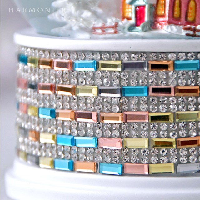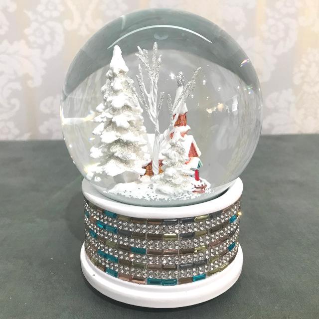 煌びやかなベースのドームの中に雪景色とパステルカラーの教会が入ったオルゴール付きスノードーム
