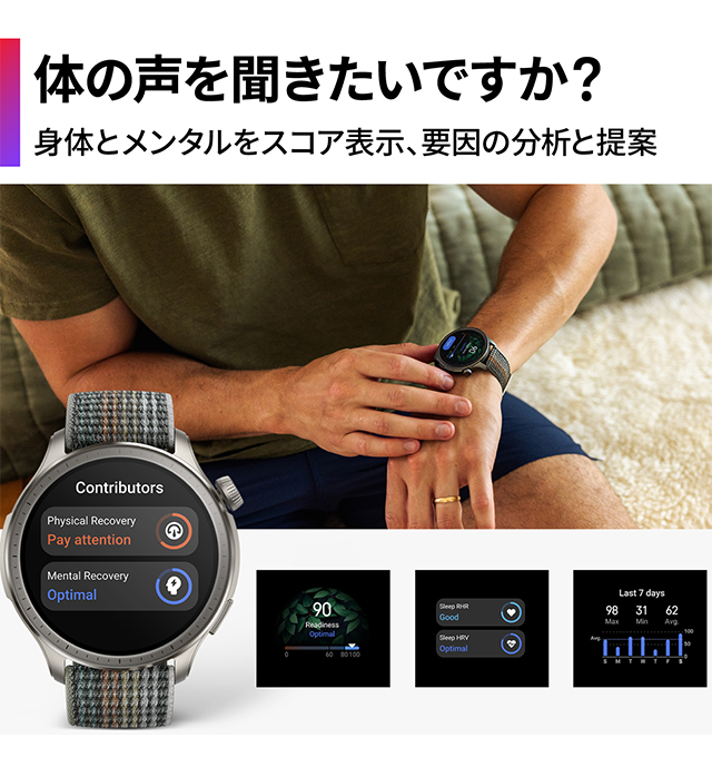 | 仕様 | 5ATM 【ディスプレイ】 素材:AMOLED サイズ:1.5インチ 解像度:480×480 PPI:323 【バッテリー】 駆動期間:最大14日間(標準使用) 容量:475 mAh(標準値) 充電方法:マグネット式充電 充電時間:約2時間 【センサー】 健康:バイオトラッカー5.0 PPG(血中酸素、8PD+2LED)、生体電気インピーダンスセンサー(BIA) 運動:加速度センサー、ジャイロセンサー、地磁気センサー、気圧センサー、環境光センサー、温度センサー 接続:Wi-Fi 2.4GHz, Bluetooth 5.0 デュアルバンド & 6 衛星測位システム 【その他】 アプリ:Zeppアプリ ※タブレット未対応 対応デバイス:Android 7.0 以上、iOS 14.0 以上 |