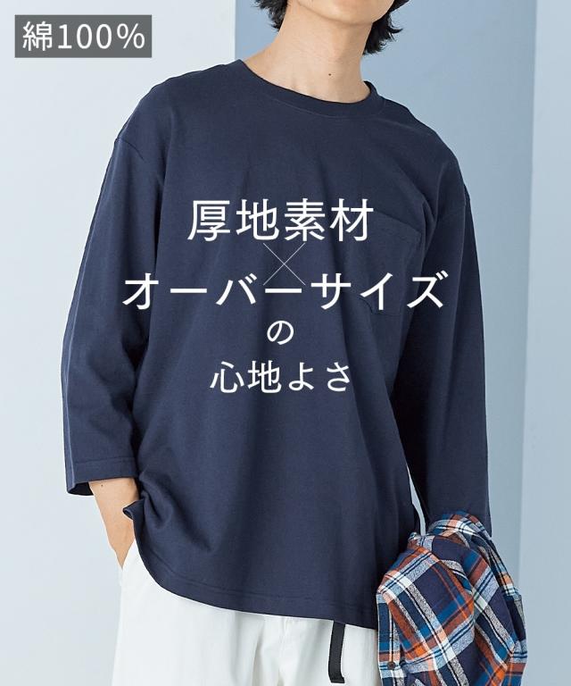 Tシャツ カットソー メンズ 綿100% ヘビーウェイトオーバーサイズ7分袖 胸ポケット付 オフホワイト/チャコール/ネイビー/黒 M/L/LL ニッセン nissen