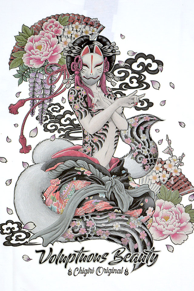 花魁に扮した狐の妖艶な姿が印象的な一着です。