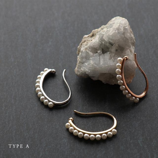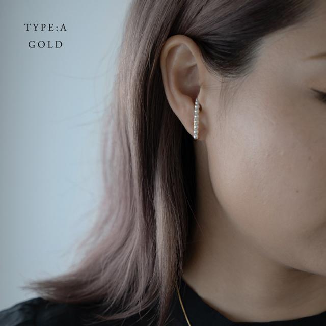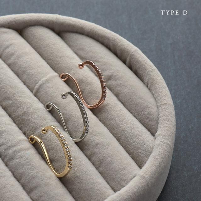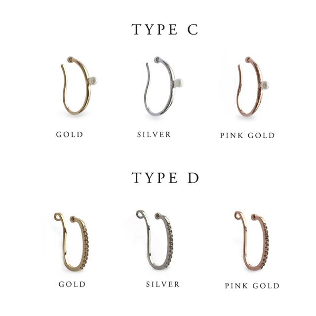 | 耳の軟骨部分を挟むように引っ掛けるウェアリング(イヤーカフ)です。 パールが美しいA・B・Cタイプ、ストーンが耳元に映えるDタイプからお選びいただけます。 控えめサイズながら程よい存在感で耳元に華やかさをプラスしてくれます。 | |