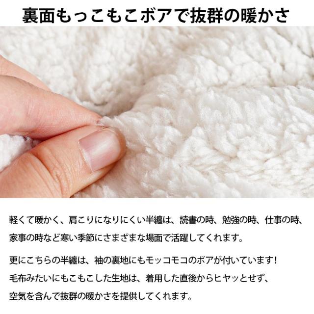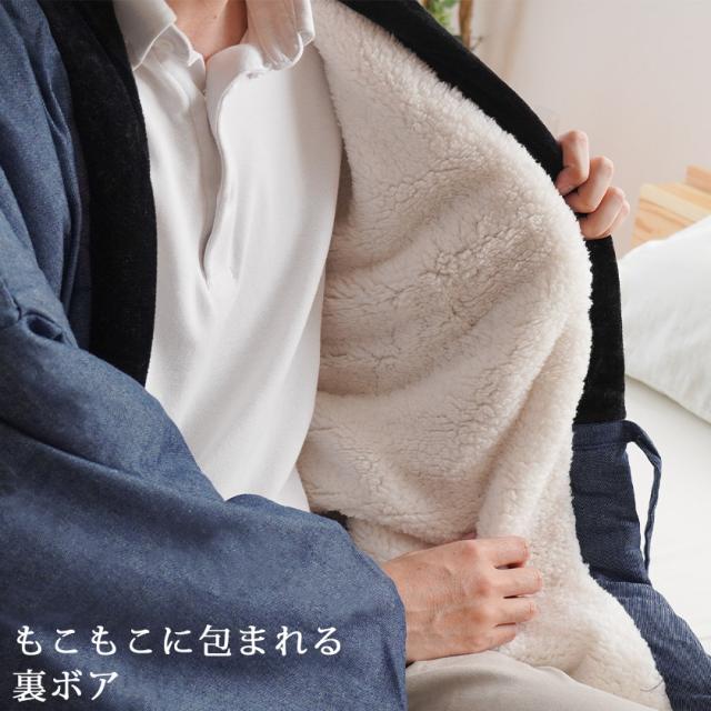 ・裏面もこもこボアで抜群の暖かさ 軽くて暖かく、肩こりになりにくい半纏は、読書の時、勉強の時、仕事の時、家事の時など寒い季節にさまざまな場面で活躍してくれます。更にこちらの半纏は、袖の裏地にもモッコモコのボアが付いています。毛布みたいにもこもこした生地は、着用した直後からヒヤッとせず、空気を含んで抜群の暖かさを提供してくれます。寒がりな男性や、部屋の空調の温度設定を低く保ちたいエコなあなたにお勧めです。 |