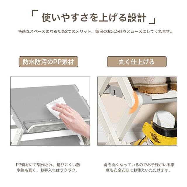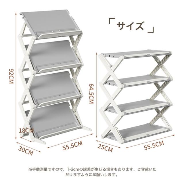 - 注文してすぐに届きました。工具がいらないので組み立て簡単でした。斜めに使うとスリムで良かったです。ただ、写真のように靴3足は並びませんでした。2.5足分位の幅でした。そこだけは残念でした。
