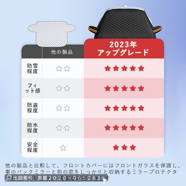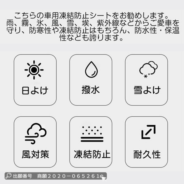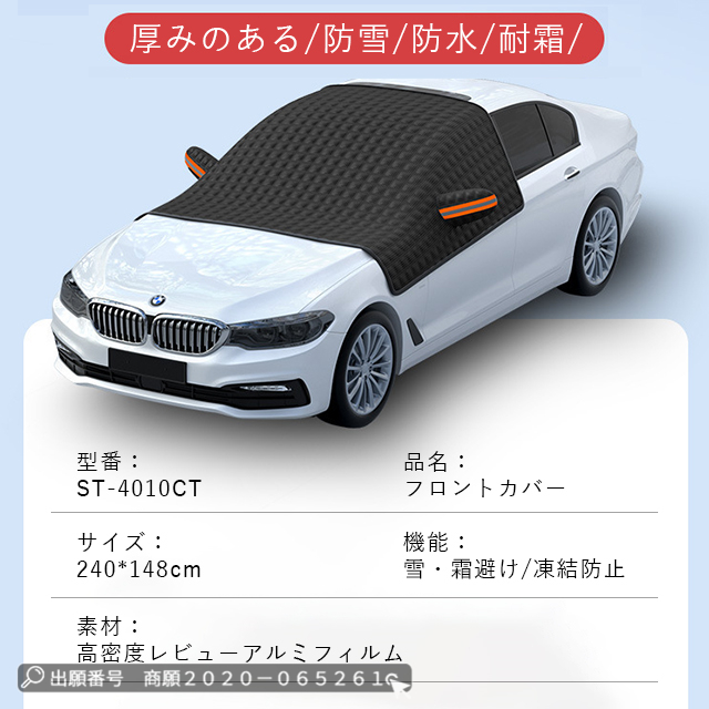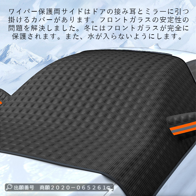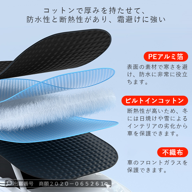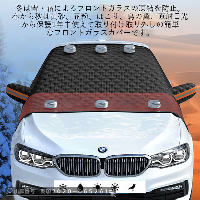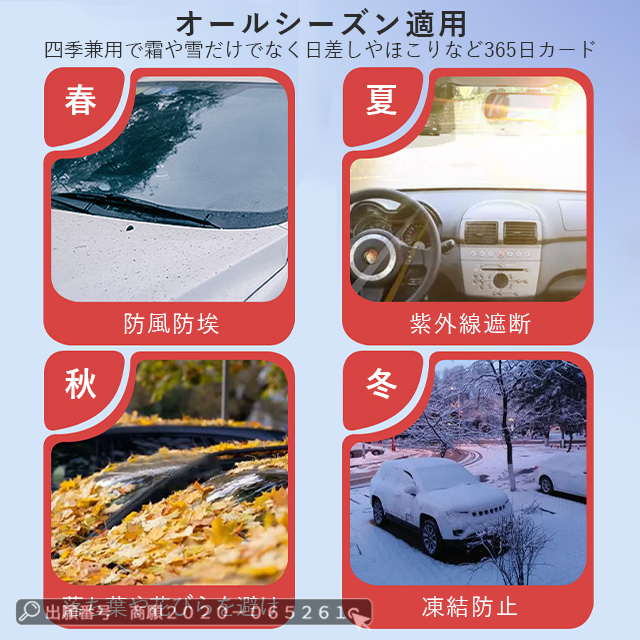 | 特 徴 | 「付け外し簡単・盗まれない・5枚磁石設計」 ◆磁石12枚内蔵されており、強風でも安心できます。◆ドアに挟める耳があるので、両サイドのゴム紐と一緒に使えば盗まれる心配はありません。◆使わない時は、折りたたんでコンパクトに収納でき、車内のすき間にさっと入れられます。「より優れた素材」 ◆車フロントカバーは表面材料としてのコーティング素材は、厚さにより、フロントガラスカバーは氷や風の強い日でも車にぴったりとフィットできます。遮光率99%以上!裏面はPEフィルを使って防寒性を誇り、積雪しても凍結しにくいです。防水性もあり、傷つきにくい頑丈な構造ので、耐久性にも期待できます。 「四季兼用」 ◆春には車の防雨防塵のこと、夏には車サンシェードのこと、秋には落ち葉や鳥糞を避けること、冬には積雪や凍結防止のことに使えます。◆どんな季節にも対応できるフロントガラスカバーです。◆一枚だけで一年中ご愛車をしっかり保護できる!それにピクニックパッド、座布団としても使用できます。 |