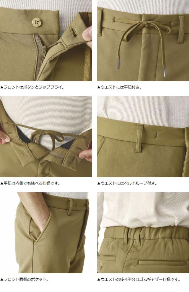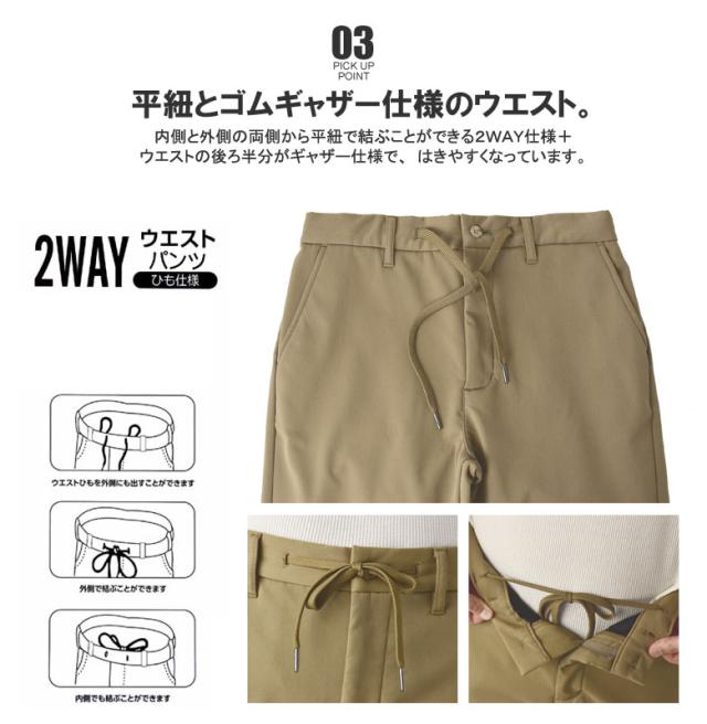 腰ひも装備され、ベルト要らずで穿くこともでき、