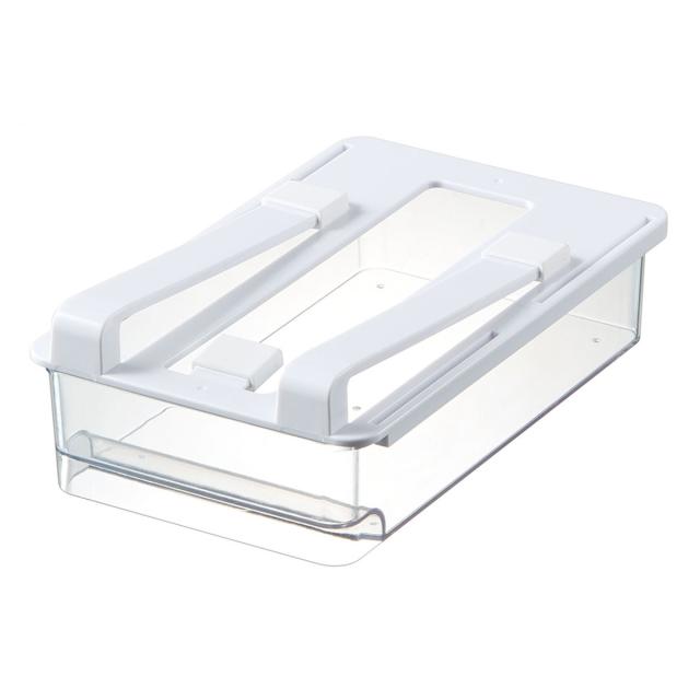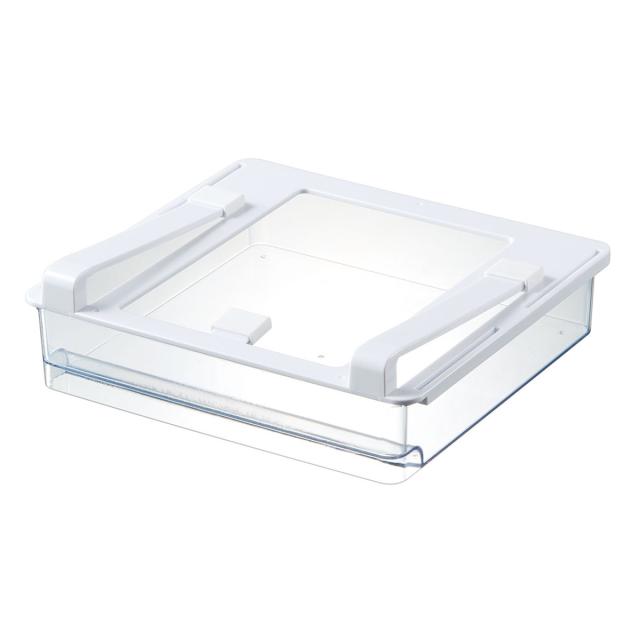 冷蔵庫の棚板に差し込むだけで簡単に設置できる引き出しです。散らかりがちな調味料をすっきり収納できます。透明だから中の物が見つけやすく、奥に入れた物をすぐに取り出せます。