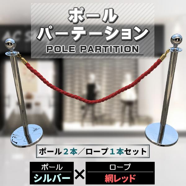 ポールパーテーション 2本 セット シルバーポール レッドロープ 縄 ガイドポール ポール スタンド パーテーション 通路 仕切り 整列 案内 ガイド 受付 屋外 室内