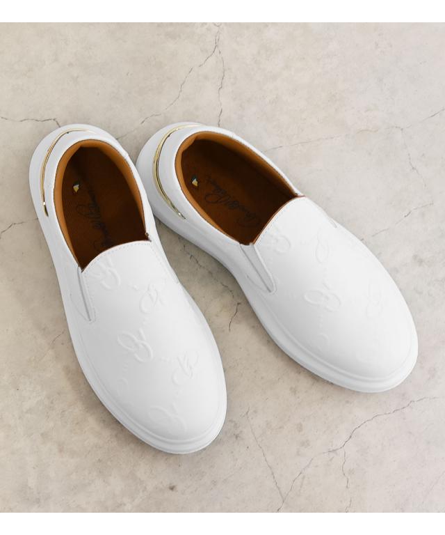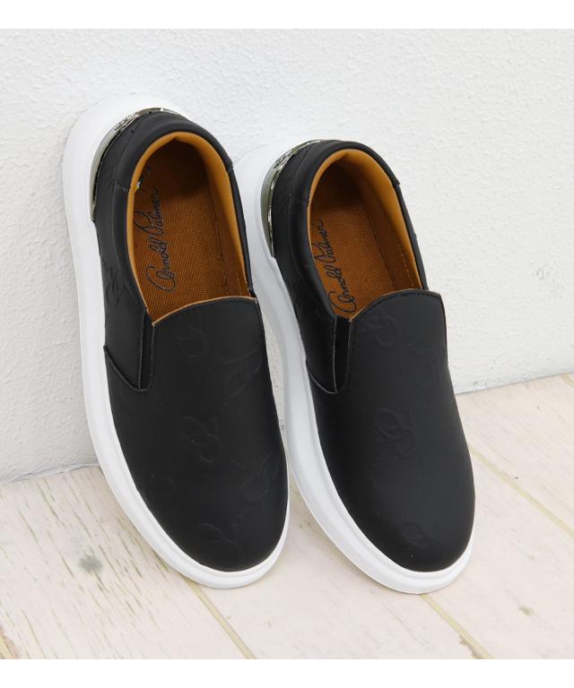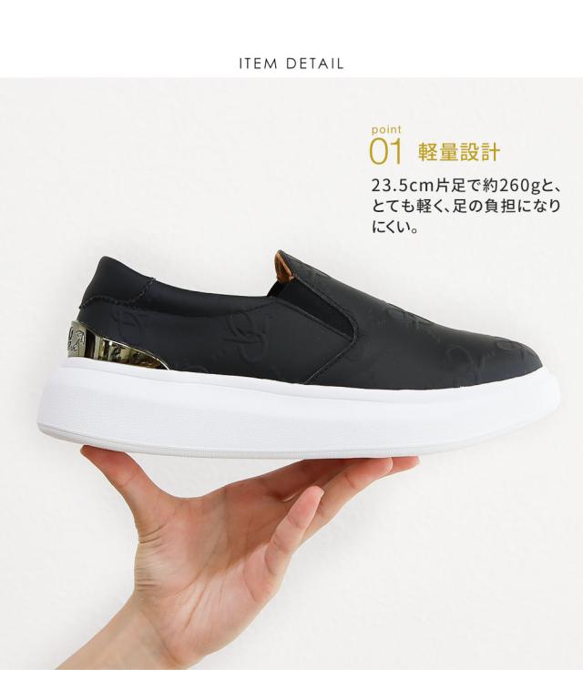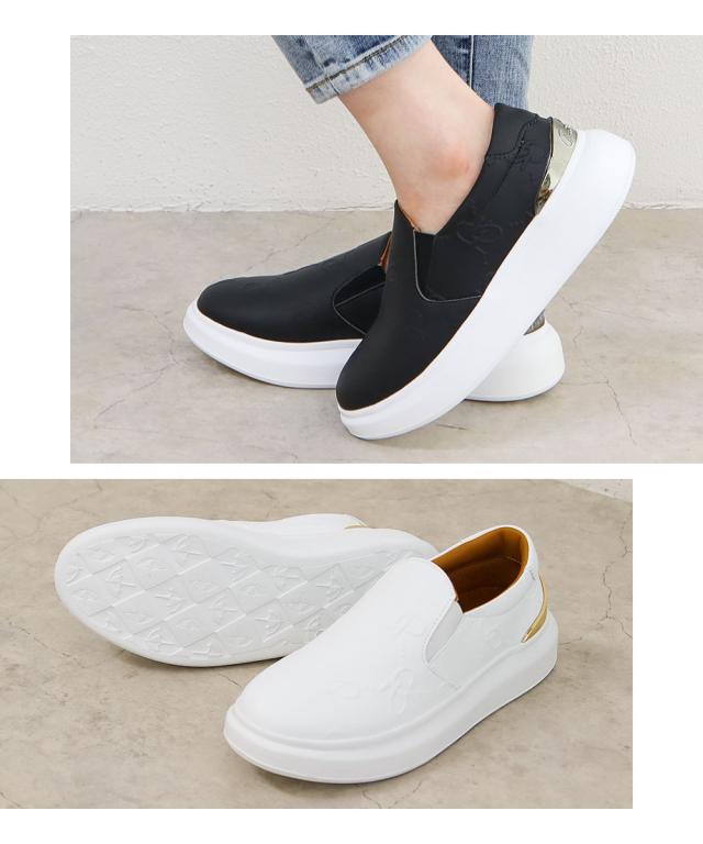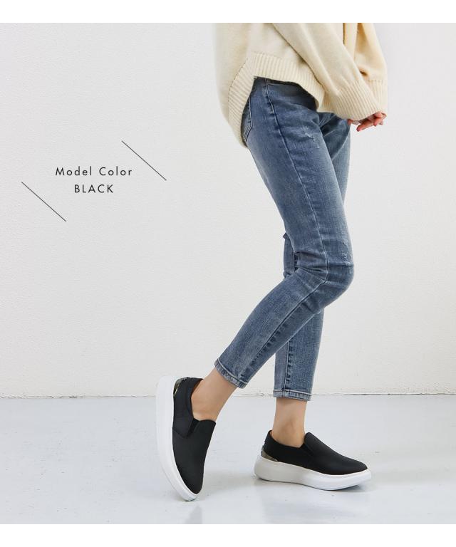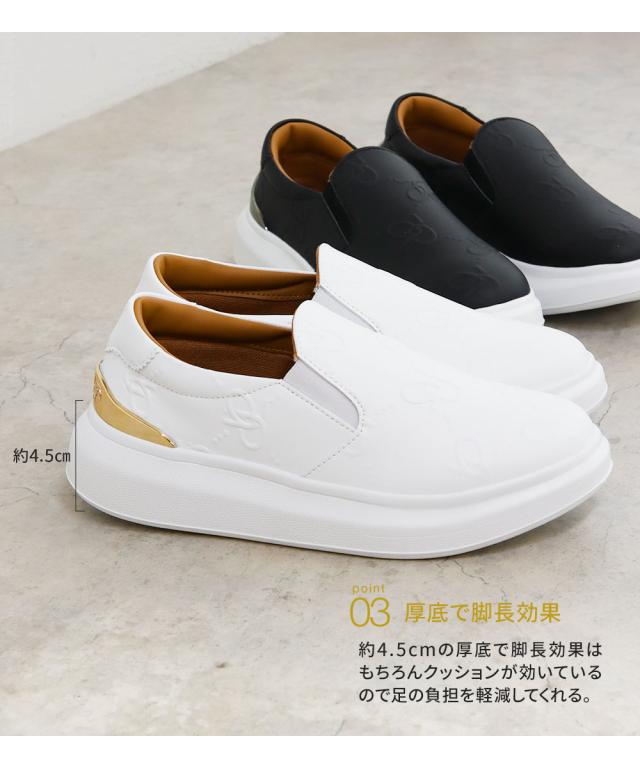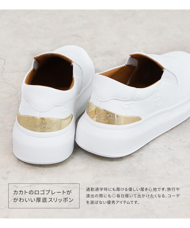 カカトのロゴプレートがかわいい厚底スリッポン。