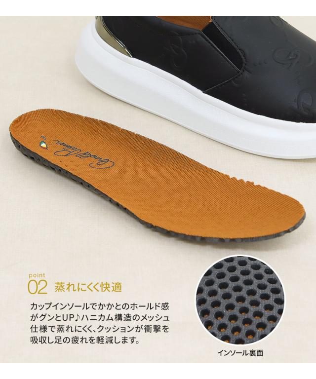 インソールはハニカム構造のメッシュ仕様で蒸れにくく、クッションが衝撃を吸収し足の疲れを軽減します。