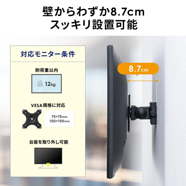 ●壁に取り付けてモニターを設置できる壁掛けモニターマウントです。●VESA規格に対応し、100×100mm、75×75mmに対応するモニターの設置が可能です。
