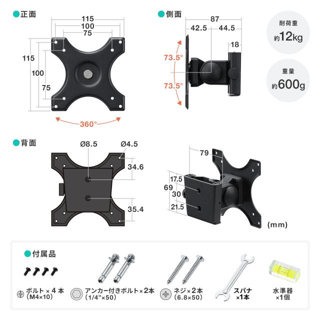 ⇒ご購入の前にご確認下さい最大34インチまで、12kgまでのモニター・テレビを設置できる、壁掛け金具。家庭やオフィス、店舗など、どこでも簡単に壁へモニターを設置でき、回転、上下角度調整も可能。【WEB限定商品】