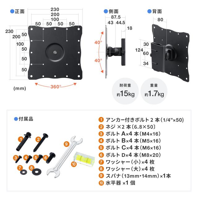 ⇒ご購入の前にご確認下さい最大42インチまで、15kgまでのモニター・テレビを設置できる、壁掛け金具。家庭やオフィス、店舗など、どこでも簡単に壁へモニターを設置でき、回転、上下角度調整も可能。【WEB限定商品】