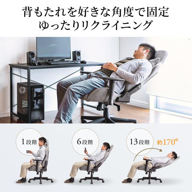 ⇒ご購入の前にご確認下さいリクライニング機能付きで傾斜角170°まで倒すことが出来るファブリック素材チェア。作業に集中することができる前傾姿勢にすることができる特殊座面。体を包み込むことが出来るバケットシート形状。上下調節可能なヘッドレスト、ランバーサポート、アームレストを標準装備。脚を乗せてもずり落ちない滑り止め付きレッグフレーム。【WEB限定商品】