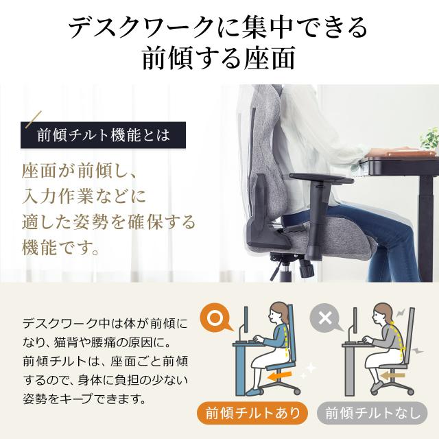 ●ゲームや仕事に集中したい時は、座面を前に倒して前傾姿勢になり背筋を伸ばして座れます。