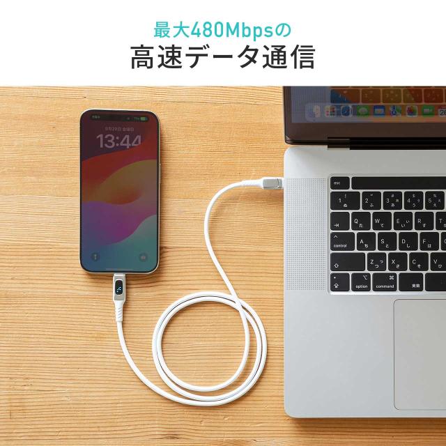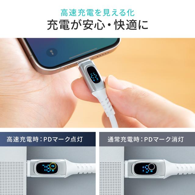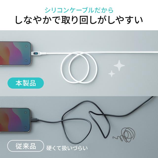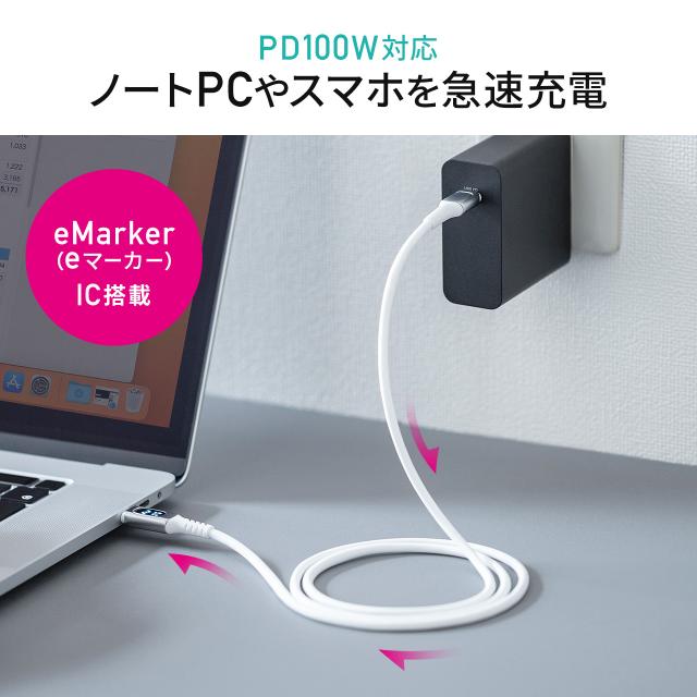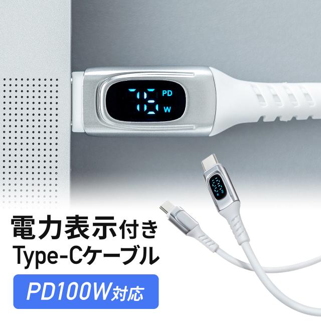 PD電力表示機能付き USB Type-Cケーブル USB PD100W対応 e-marker搭載 1m やわらかシリコンケーブル USB2.0 充電 データ転送 スマホ タブレット ホワイト[500-USB077]