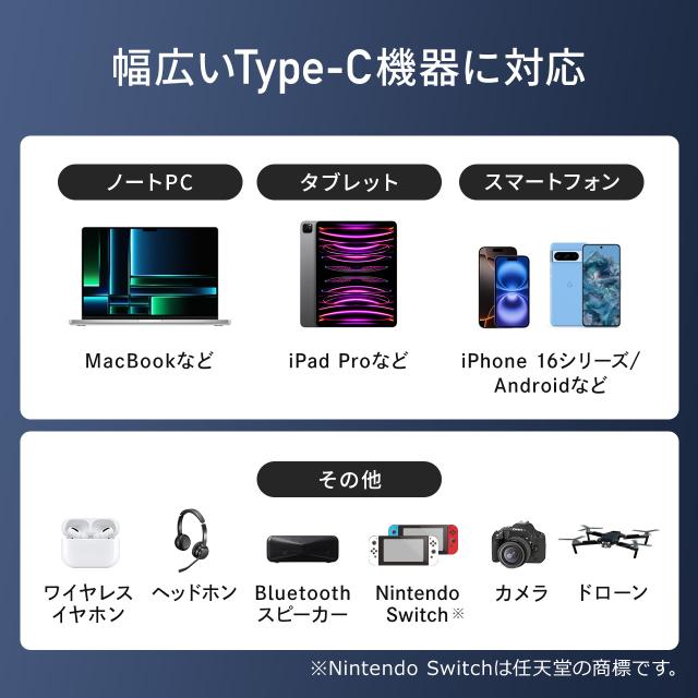 ●USB Type-Cポートを搭載した機器と接続し、充電やデータ転送をする事ができます。