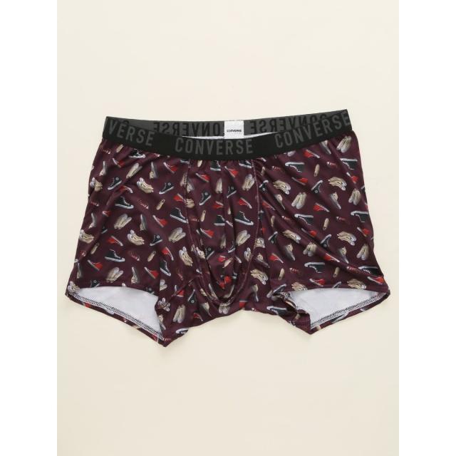 前閉じのボクサーパンツです。フロントが立体構造になっています。コンバーススニーカーのイラストを使った総柄プリント。股上はセミローライズの仕様でピタッとした穿き心地です。