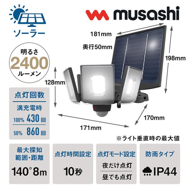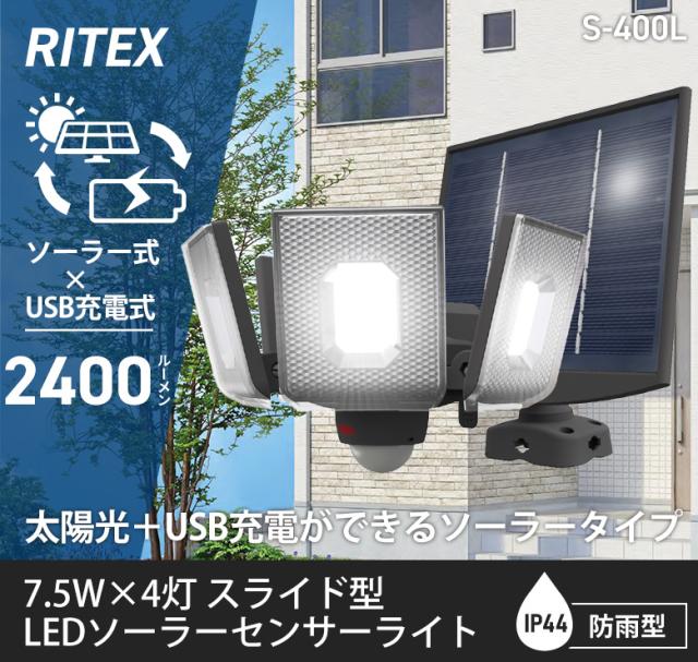 【47%引き】 人感センサーライト 屋外 防犯ライト ムサシ RITEX 7.5W×4灯 スライド型LEDソーラーセンサーライト(S-400L) 充電式 ソーラー式 ダブル ハイブリッド式 玄関 ガレージ 照明 防犯グッズ LEDライト 明るさ調整