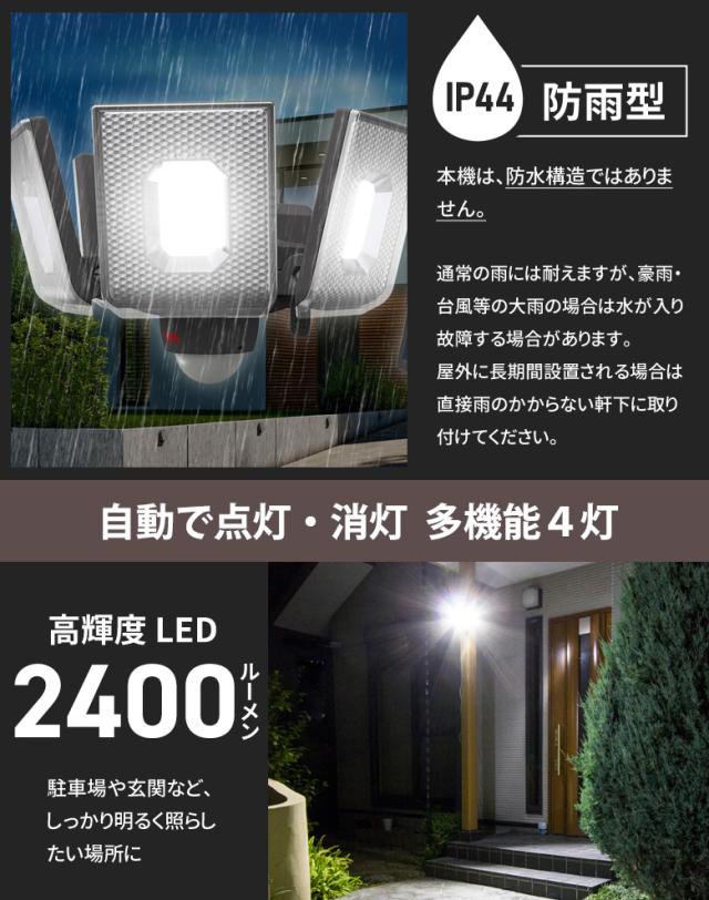 | A. 防雨規格IP44をクリアしているものについては、いかなる方向からの飛沫によっても有害な影響を受けない防雨構造です。通常の雨程度ではまったく問題ありませんが、防水タイプではありませんので台風や激しい暴風雨に長時間さらされた場合水が入ってしまい故障する可能性があります。一旦屋内などに退避していただくことをおすすめいたします。 もし台風の後などにセンサーライトの調子が悪くなった場合は、一度乾電池・充電器・ACコード等の電源を抜き差ししていただき、様子を見てください。 |