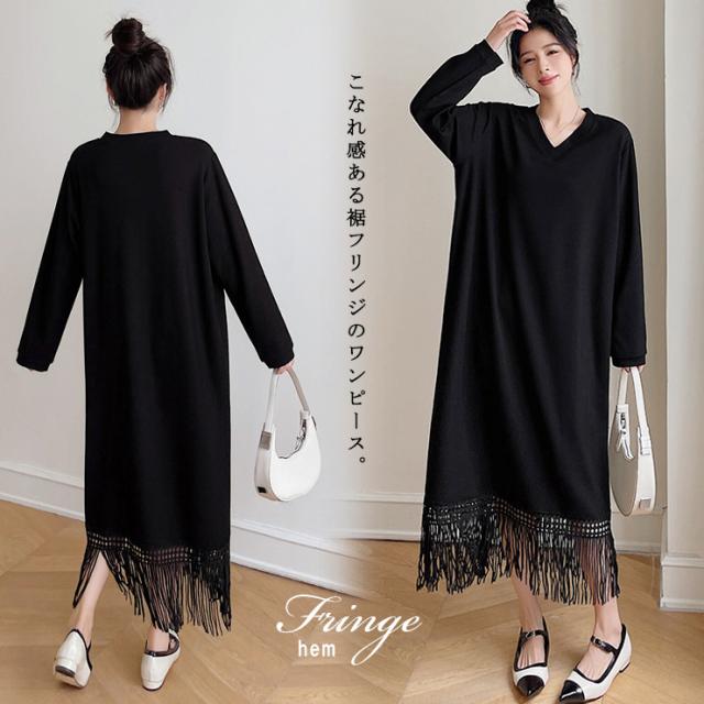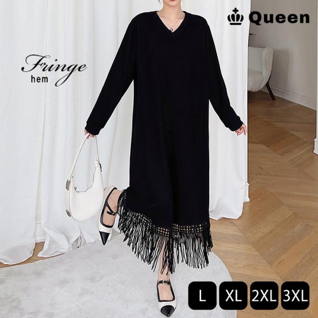 リブワンピ 無地 裾フリンジ シンプル ぽっちゃり 5L 6L