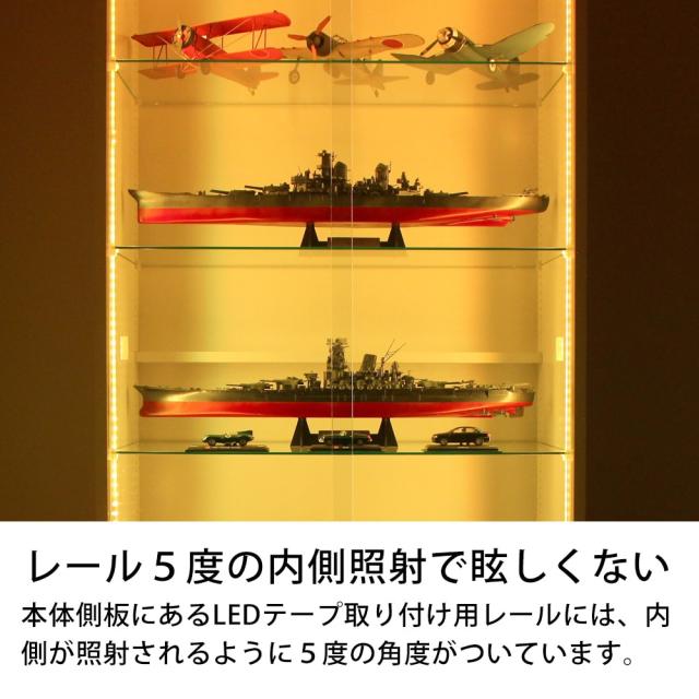 戦艦などの大型コレクション、シリーズラインナップが豊富なフィギュアもスッキリ収納できます。フィギュアやプラモデルなど自慢のコレクションをたくさん展示してコレクションルームに。鍵付プッシュオープンガラス扉で大切なコレクションを守ります。セットのLEDモジュールセットは左右側板のレールに設置できます。 左右から内側に向けてLEDライトが照射され、上から下までコレクションを美しく照らします。 LEDライトでフィギュアやプラモデルの凹凸や陰影がはっきり映し出され、お気に入りのコレクションが際立ちます。 本体下部分にON/OFFスイッチを取り付ける事ができ、配線も全て収納できます。