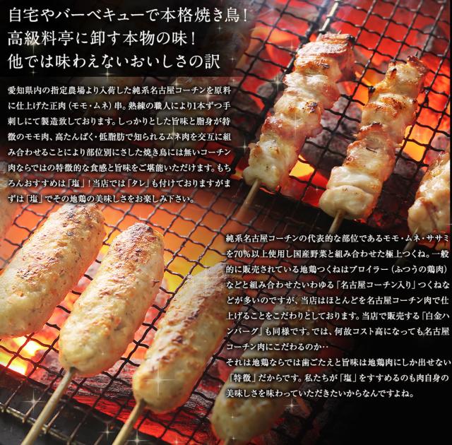 - 名古屋コーチンの焼き鳥セット初めて購入しました。 凄く良い商品でタレや胡椒も入っていたので大変、大満足な商品でした。 対応もスムーズで大満足です。