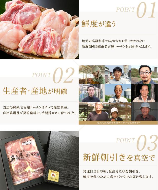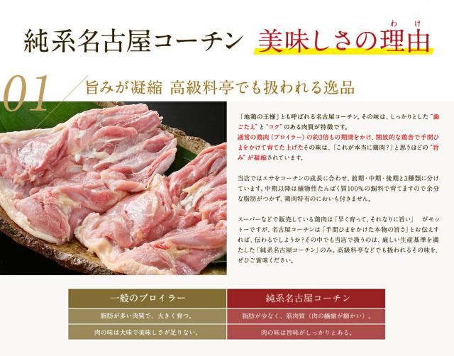 | 内容量 | 純系名古屋コーチン モモ肉 2枚 純系名古屋コーチン ムネ肉 2枚 純系名古屋コーチン ササミ 2本 |