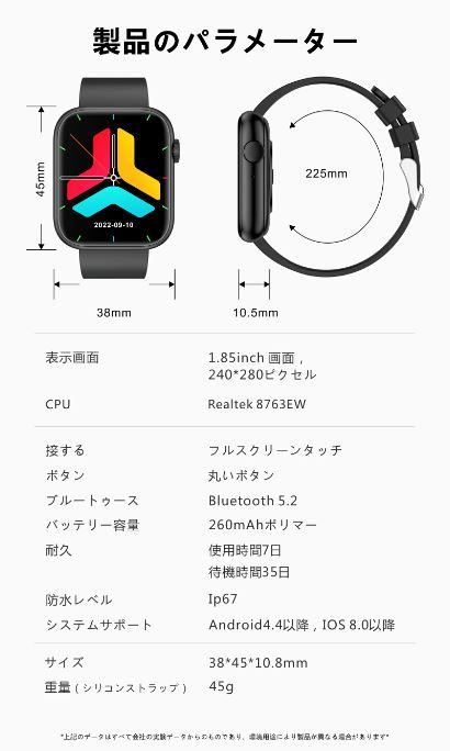 【本体 商品仕様】 画面サイズ:1.85インチ スクリーン:240×280ピクセル その他:フルタッチスクリーン 回転リューズ付き CPU:Realtek8763w Bluetooth接続:Bluetooth5.2(Bluetooth4以降対応) バッテリー容量:260mAh 防水:IP67 防塵レベル6 防水レベル7 対応OS:Android4.4以降 IOS8.0以降 材質:シリコン製(ストラップ) 重さ:約45g 充電端子:マグネット式 |