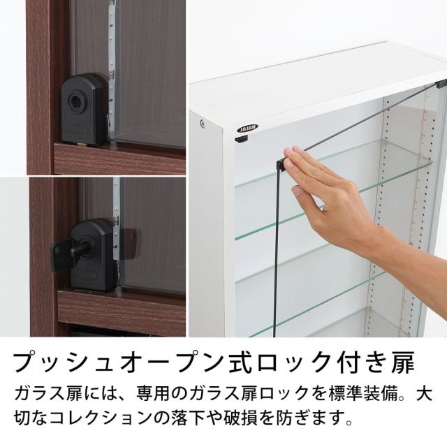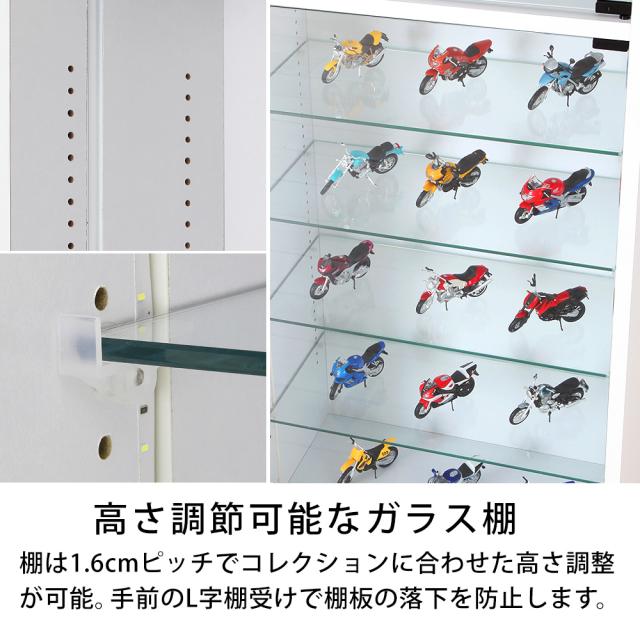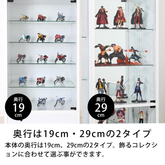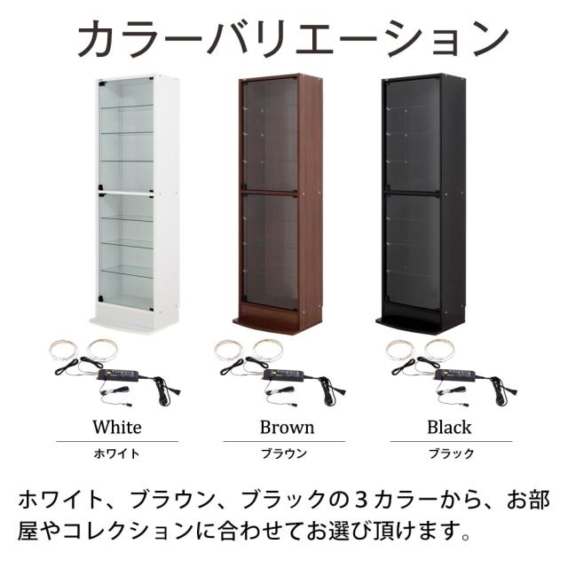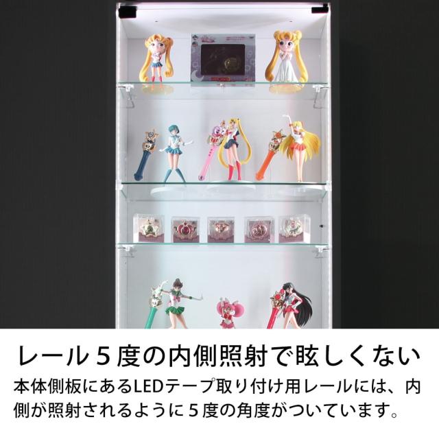 フィギュアやプラモデルなど集めて並べるコレクションラックレギュラーハイタイプ 幅55cm×奥行29cm×高さ180cm。インテリアに合わせて省スペースからはじめられる幅55cmのコレクション専用ラックです。鍵付プッシュオープンガラス扉で大切なコレクションを守ります。セットのLEDモジュールセットは左右側板のレールに設置できます。 左右から内側に向けてLEDライトが照射され、上から下までコレクションを美しく照らします。 LEDライトでフィギュアやプラモデルの凹凸や陰影がはっきり映し出され、お気に入りのコレクションが際立ちます。 本体下部分にON/OFFスイッチを取り付ける事ができ、配線も全て収納できます。