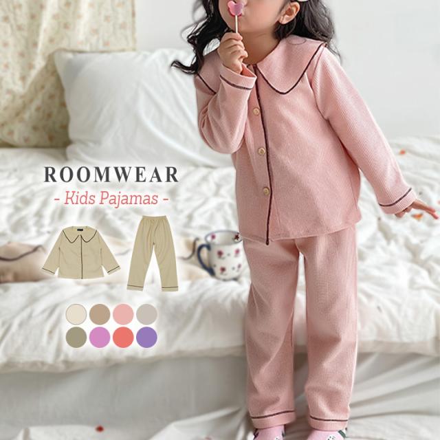 春新作 キッズ パジャマ 長袖 春秋 薄手 女の子 トップス ボトムス 2点セット ルームウェア 部屋着 ナイトウェア ロングパンツ 上下 前開き ウエストゴム パイピング バイカラー 肌に優しい ワッフル 凹凸 110 120 130 140 150 160