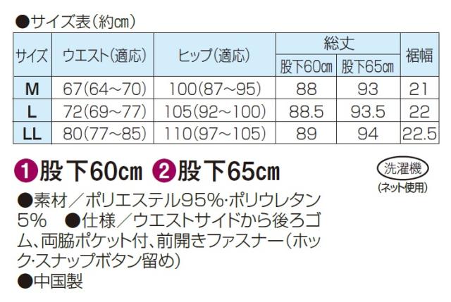 ●仕様/ウエストサイドから後ろゴム、両脇ポケット付、前開きファスナー(ホック・スナップボタン留め)