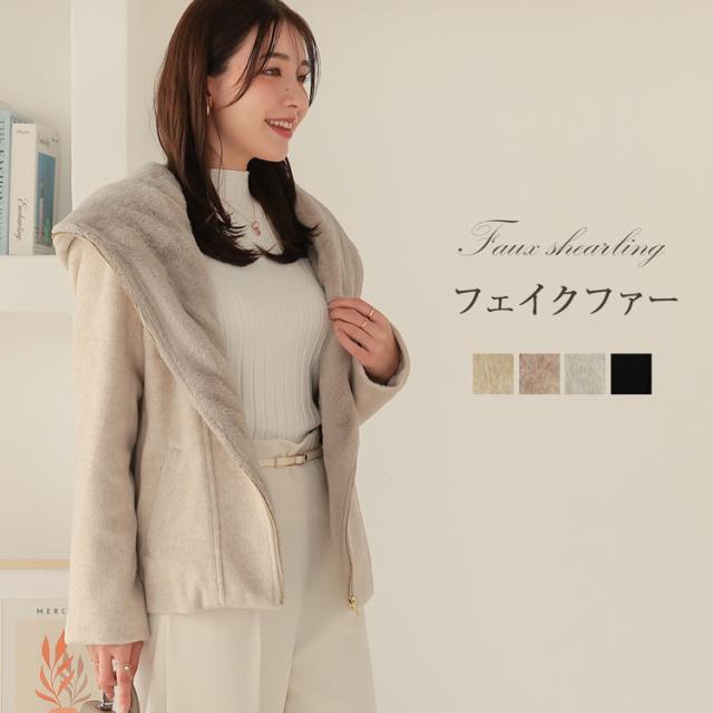 コート ジャケット ショート レディース ショートコート アウター 上品 きれいめ 冬 秋 フード ファー フェイク ウール 暖かい フェイクファー ジップアップ ショート丈 フード付き 裏地付き 黒 ベージュ グレー モカ あったか ジップ フーデットコート ショート丈コート