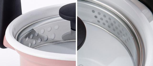 付属のガラス蓋は、調理の具合を確認しやすいことに加え、リム部分の巣穴で湯切りができるようになっています。巣穴は2サイズあるので、「大」はショートパスタ、「小」は茶葉や出汁など、食材の大きさによって使い分けができ便利です。